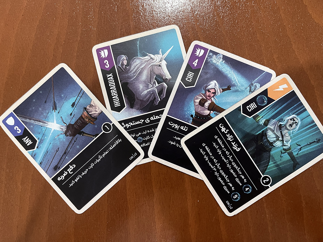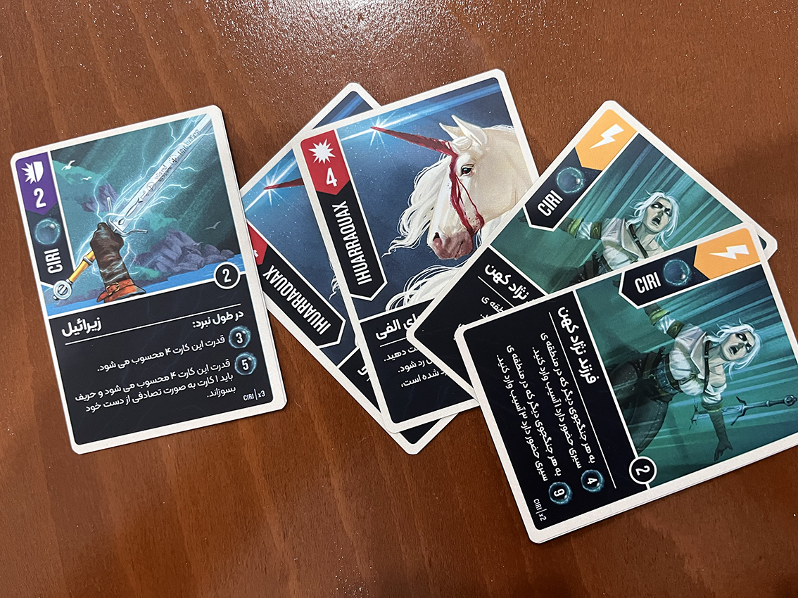 کارت های فارسی شده ی بردگیم آنمچد: ویچر (Unmatched: Witcher) نسخه فولاد و نقره (Steel & Silver) -ترجمه: آریا صلاحی - طراحی گرافیک: آریا صلاحی -جنس کارت ها: گلاسه۳۰۰ گرم با سلفون مات
